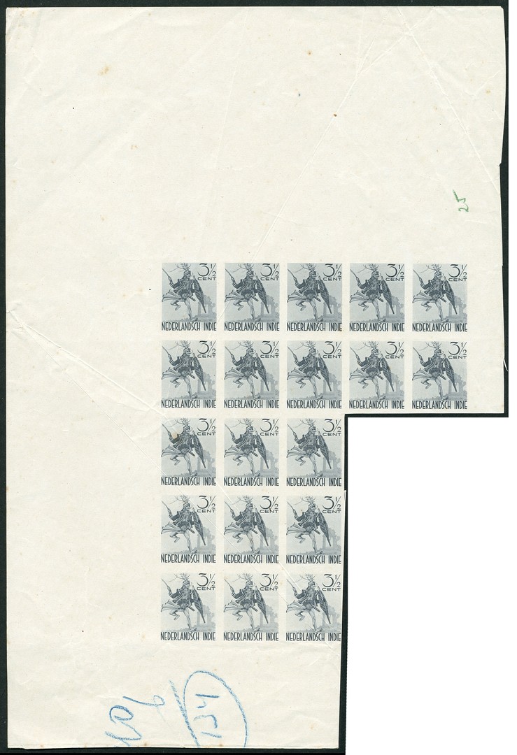300, Inheemse dansers, 3½ cent danser uit het eiland Nias, niet-uitgegeven waarde in de tekening van de 2½ cent, zeer fraaie ongetande en ongegomde kleurproef in grijs van donker naar licht, in veldeel van negentien ex. uit velletje van vijfentwintig ex. met op velrand notities met blauw potlood