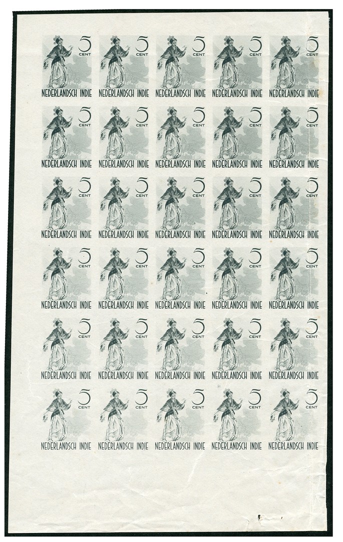302, Inheemse dansers, 5 cent Pajoge danseres uit Zuid-Celebes, vrijwel pracht ongetande en ongegomde kleurproef in grijs in velletje van dertig ex. van donker naar licht zonder achtergrondbedrukking (door rechter zegels loopt vouw), zegel nr. 29 met plaatfout ´vlek linksboven hoofd´