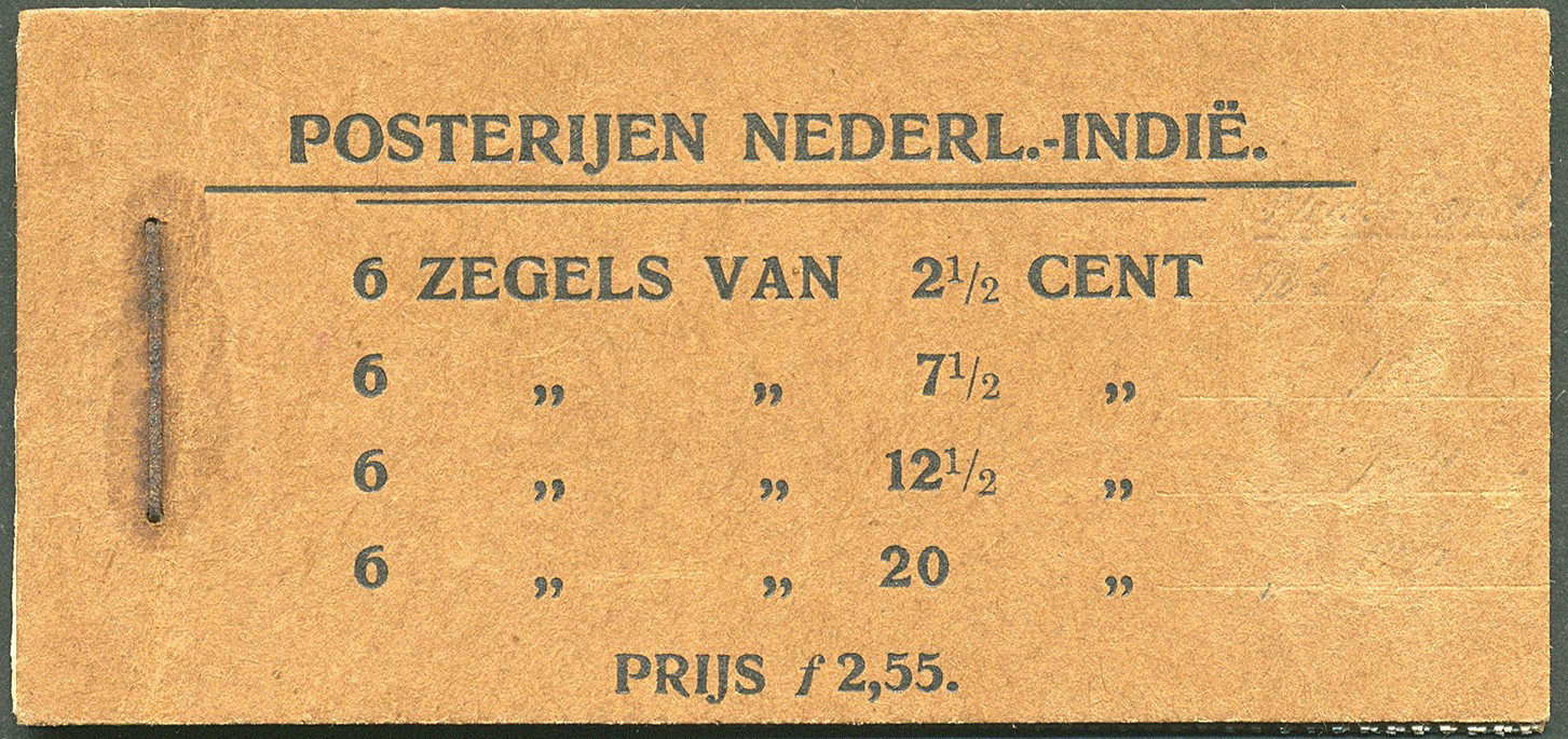 Postzegelboekje PZ9 (Horn 8A) uit 1922, met variant H, dat het velletje van zes zegels van 7½c kopstaand in het boekje is gehecht (Horn: de 7½c heeft een kopstaand cliché, en dat is zelfs de enigst bekende zegel van Nederland & O.R.), de zegels van 2½c en 7½c zijn gedrukt in watervaste kleuren, de opdrukzegels van 12½c en 20c in loslatende kleuren, kaftvariant II (20 staat rechts van de 12½), het nietje is iets roestig, overigens een prachtkwaliteit, en uiterst zeldzaam. € 2500+ cursief