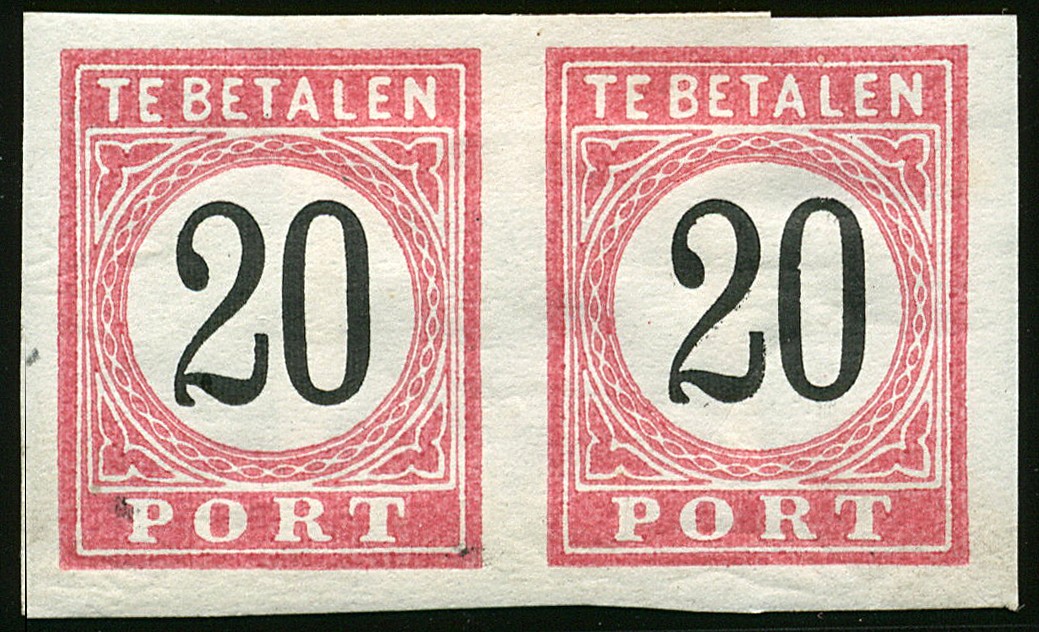 Port emissie 1882. Proeven van de goedgekeurde rand en cijfers in de gekozen kleuren op gegomd papier, ongetand, in de waarden 2½, 5, 20, 40 en 75 cent in paren. Volgens Korteweg (Proevenboek, 1931) werden proeven aangevraagd in diverse waarden in het type der nieuwe Nederlandse portzegels, met blauwe rand en zwarte waarde, maar in een andere kleur rand. Niet gecatalogiseerd. In paren uiterst zeldzaam, mogelijk uniek