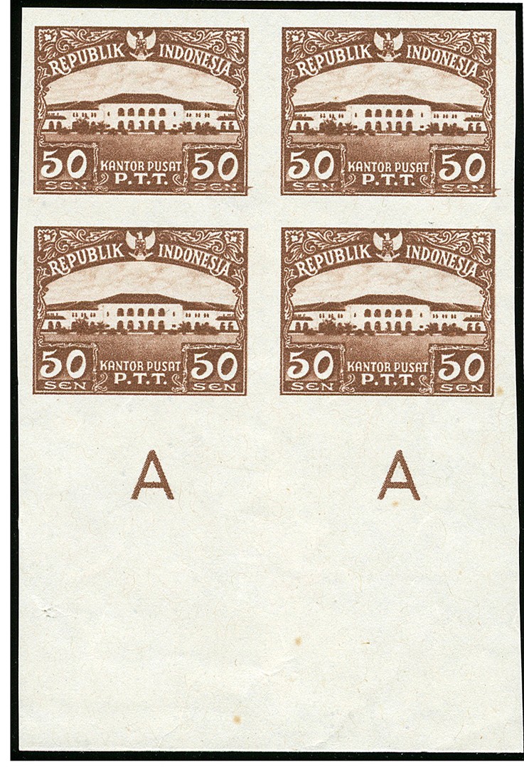 KPI.107A/111A, Hoofdpostkantoor te Bandung 1953, ongetand en ongegomd in randblokken van vier. Rp. 4.000.000