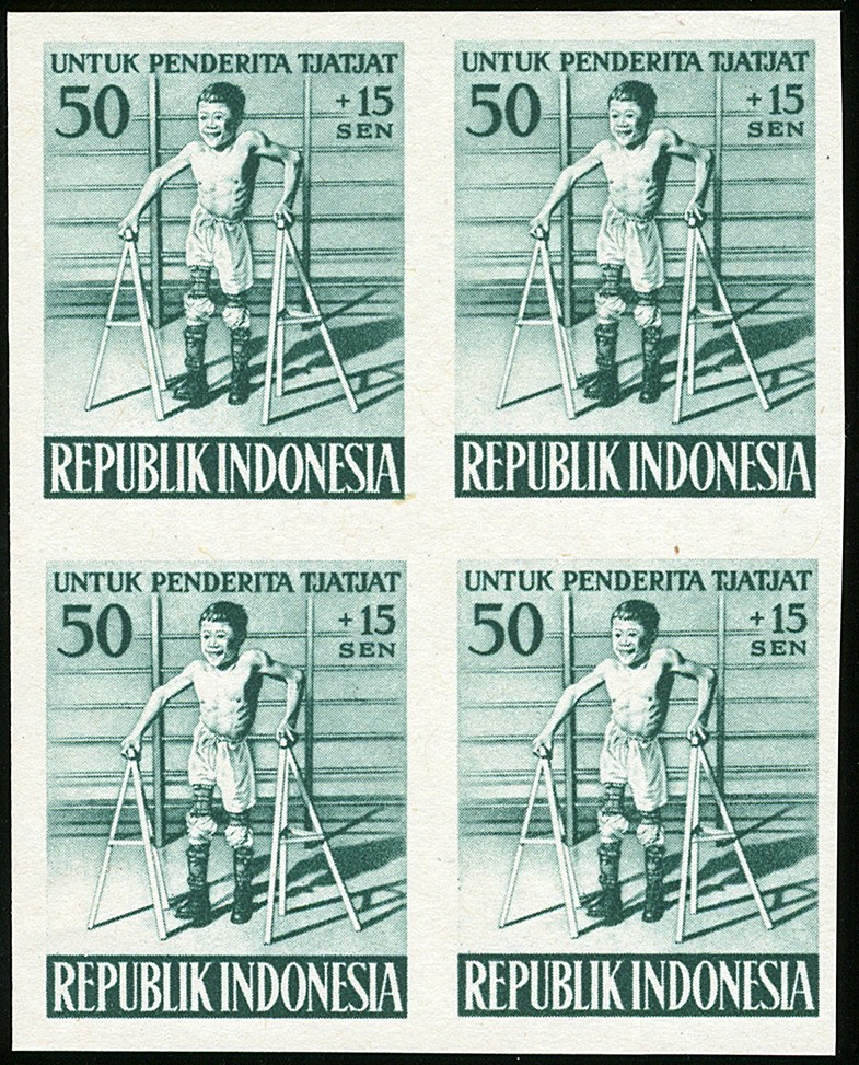 KPI.189A/194A en 192Aw/193Aw (andere kleuren), Gehandicaptenfonds 1957, ongetand en ongegomd in blokken van vier w.o. met velrand. Rp. 20.000.000