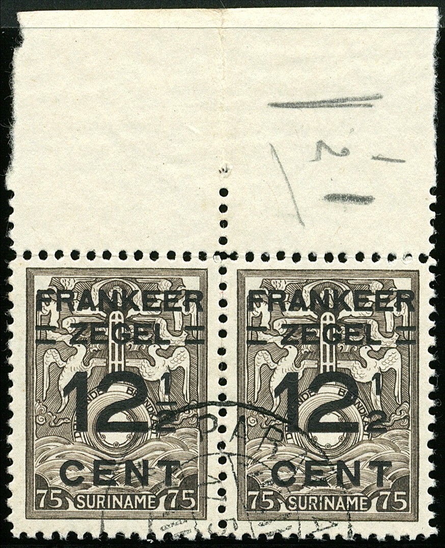 132P, Niet uitgegeven Brandkastzegel van 75c overdrukt tot frankeerzegel van 12½ cent, met opdrukfout ´12½ zonder breukstreep´. Ongebruikte bovenrandstrip van drie (iets los op tanding) waarvan het middelste ex. 132P postfris is, met keurstempeltje, alsmede gebruikt bovenrandpaar waarvan het rechter ex. 132P is. € 160