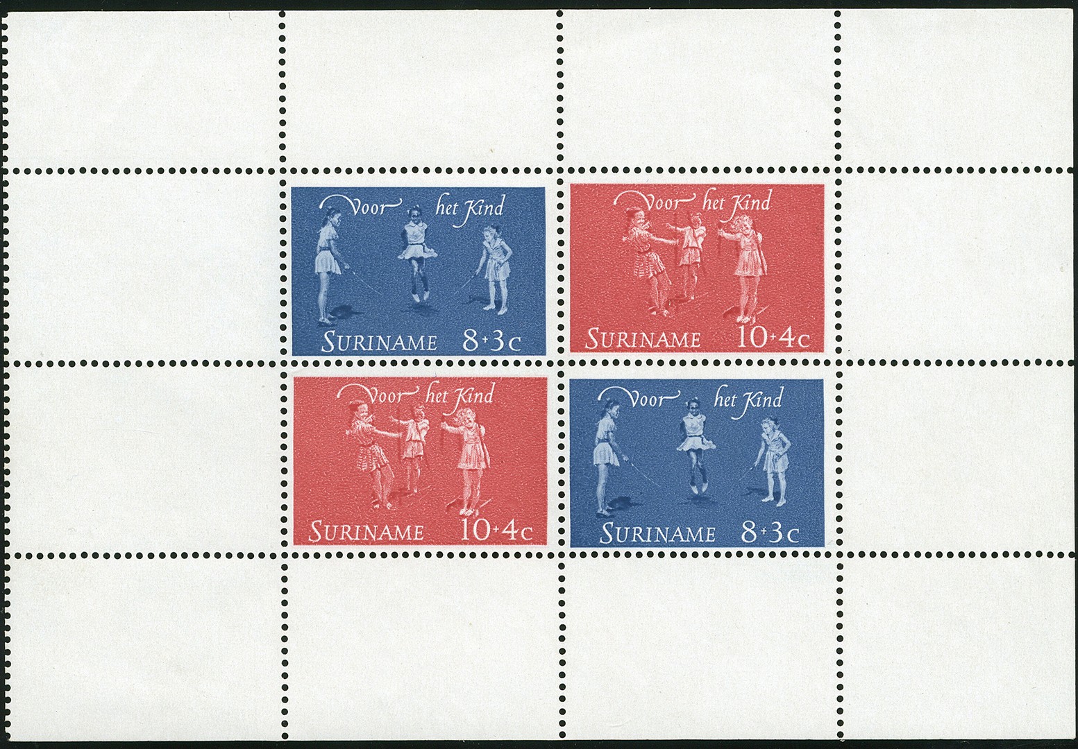 418, Blok Kinderzegels 1964 met variëteit ´Linkerrand geperforeerd´, postfris prachtblok. Zeldzaam!