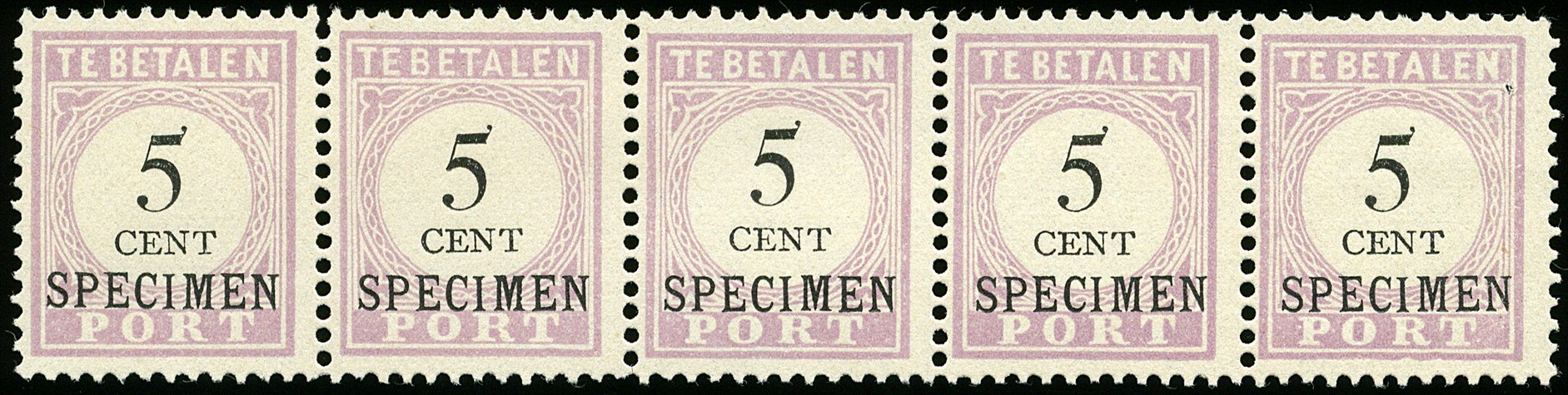 P9/11, met opdruk ´Specimen´, strippen van vijf van de 2½c typen I-III-I-III-III, 5c typen I-II-III-I-III en 10c verticaal typen I-III-III-I-III, vrijwel uitsluitend prachtex. en schaars! € 375+