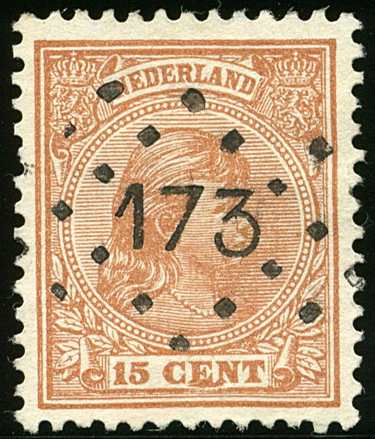173 = Gorredijk op 15c Hangend Haar. Prachtex. met plaatfout (Mast 39PM1, ? 90) waarop luxe afst.