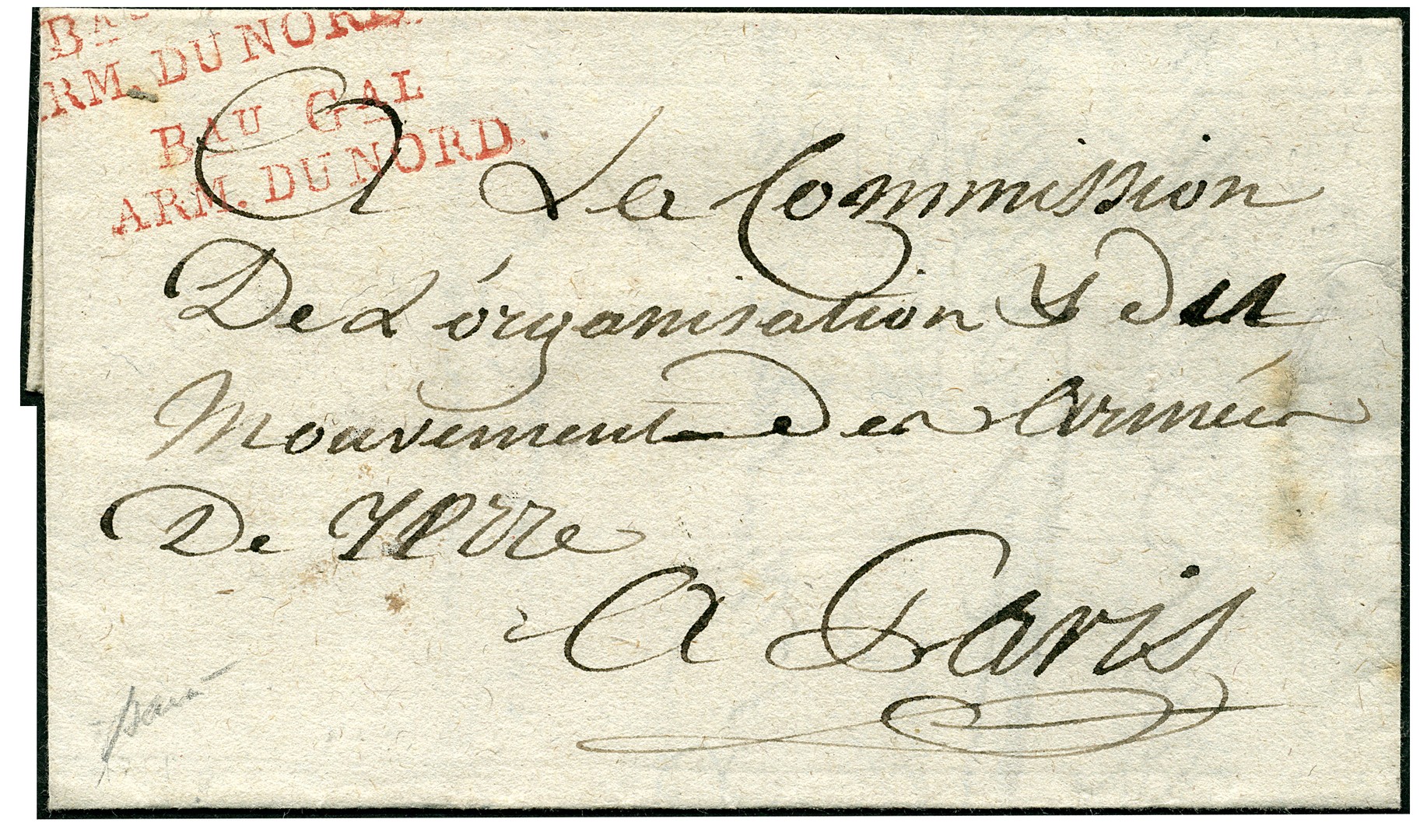 Militaria. Rode, zeer scherpe afst. ´Bau Gal/Arm. du Nord´ (PEP2.M166) op frisse vouwbrief geschreven te velde in Terheyden (bij Breda) op ´1 Ventose an 3´ = 19-2-1795, verz. naar Parijs. Keur ´Baudot´