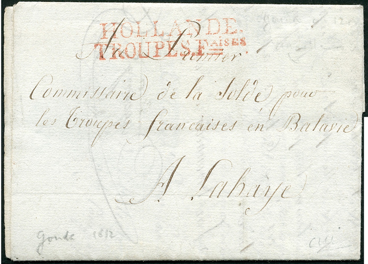 Militaria. Prachtige, deels bedrukte complete vouwbrief geschreven te Gouda op 7-5-1812 met op az. mooie portvrijdomstempel en op vz. in rood ´HOLLANDE./TROUPES Faises´, verz. naar Den Haag