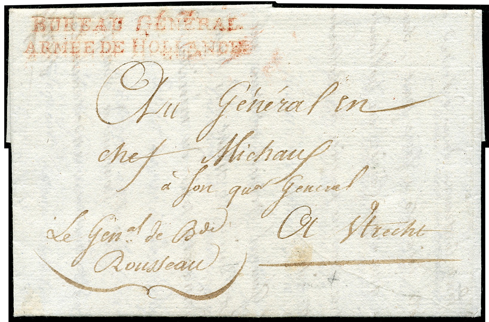 Militaria. Complete, frisse deels bedrukte vouwbrief geschreven te Rotterdam 21-9-1814 (?) met op vz. rode afdruk ´BUREAU GÉNÉRAL/ARMÉE DE HOLLANDE´, naar een generaal te Utrecht