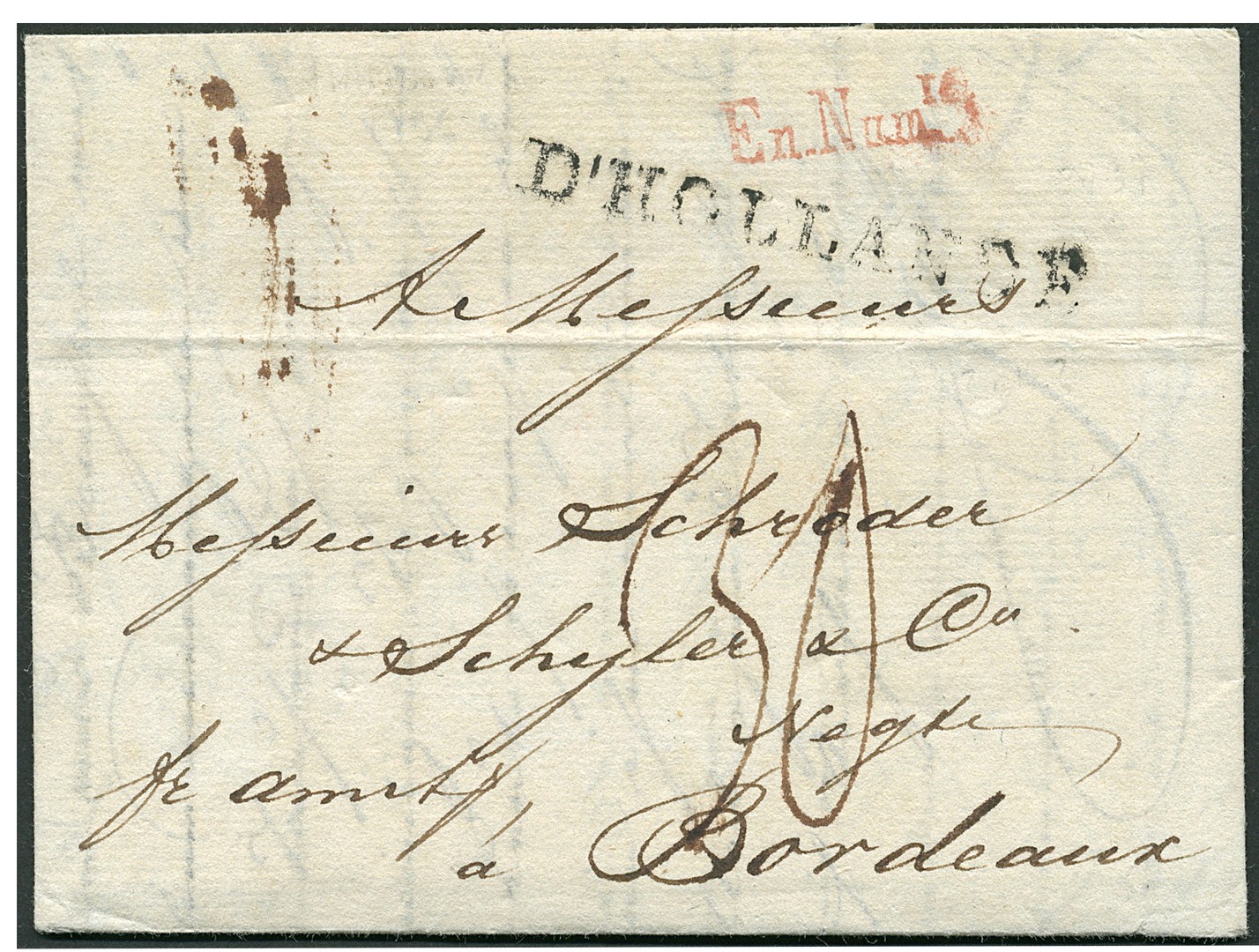 Rode afdruk van klein model ´En.Num.re.´ (= En Numeraire, in harde munt) op zeer frisse, deels gedrukte vouwbrief van Amsterdam 25-2-1796 naar Havre, alsmede op mooie vouwbrief van Hamburg 22-4-1796 naar Bordeaux 5-5, met op beide brieven tevens ´D´Hollande´