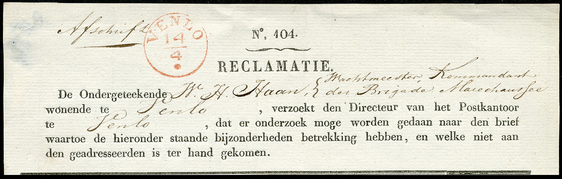 Reclamatieformulier ingevuld door een wachtmeester van de marechaussee met een verzoek aan de directeur van het postkantoor te Venlo om onderzoek te mogen doen naar de vermissing van een vooraf met 20 cent gefrankeerde brief, waarin een biljet van 10 gulden was ingesloten, afgestempeld te Venlo 14-4(-1848)