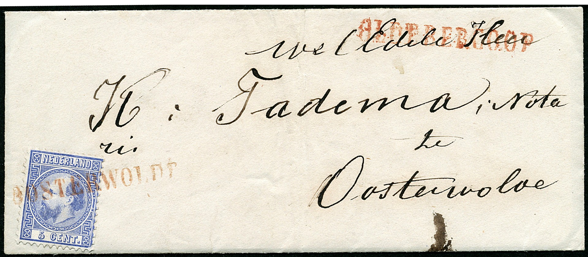 Naamstempel OOSTERWOLDE in schreefletters in rood op 5c nr. 7. Prachtex. met mooie afst. op dichtgeplakt, ongedateerd couvert van OLDEBERCOOP (rechtsboven) naar Oosterwolde. Tevens vouwbrief uit Woerden (1822) en briefomslag met naamstempels Sassenheim en Wassenaar (1862)