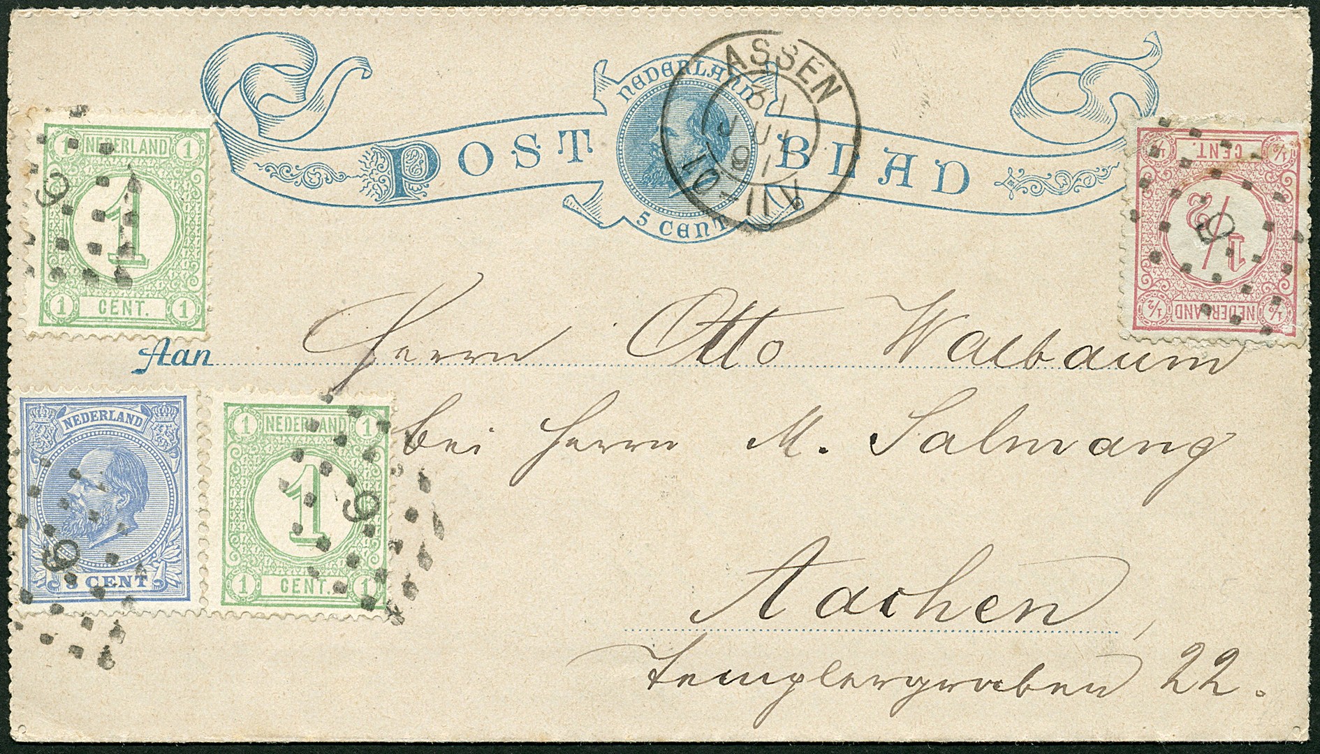 Pb. G1 aantrekkelijk bijgefr. met ½c (zeer fraai), 2x 1c en 5c van Assen 31-7-1891 naar Aken 31-7