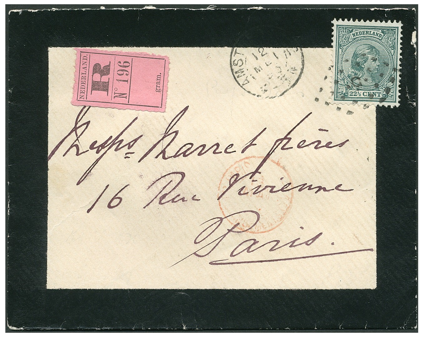 Rouwcouvert met op az. twee mooie, zwarte lakzegels, gefr. met 22½c Hangend Haar van Amsterdam 12 (of 2?) 12-5-1893 aangetekend naar Parijs 13-5