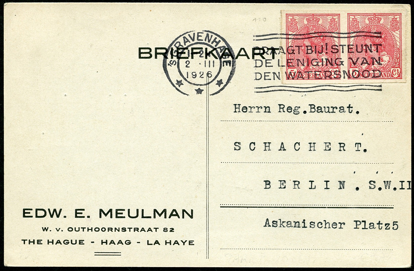5 Cent Bontkraag in ongeperforeerd paar nr. 82 op zakelijke (niet-filatelistische) bk. van ´sGravenhage 2-3-1926 naar Berlijn. Schaars!