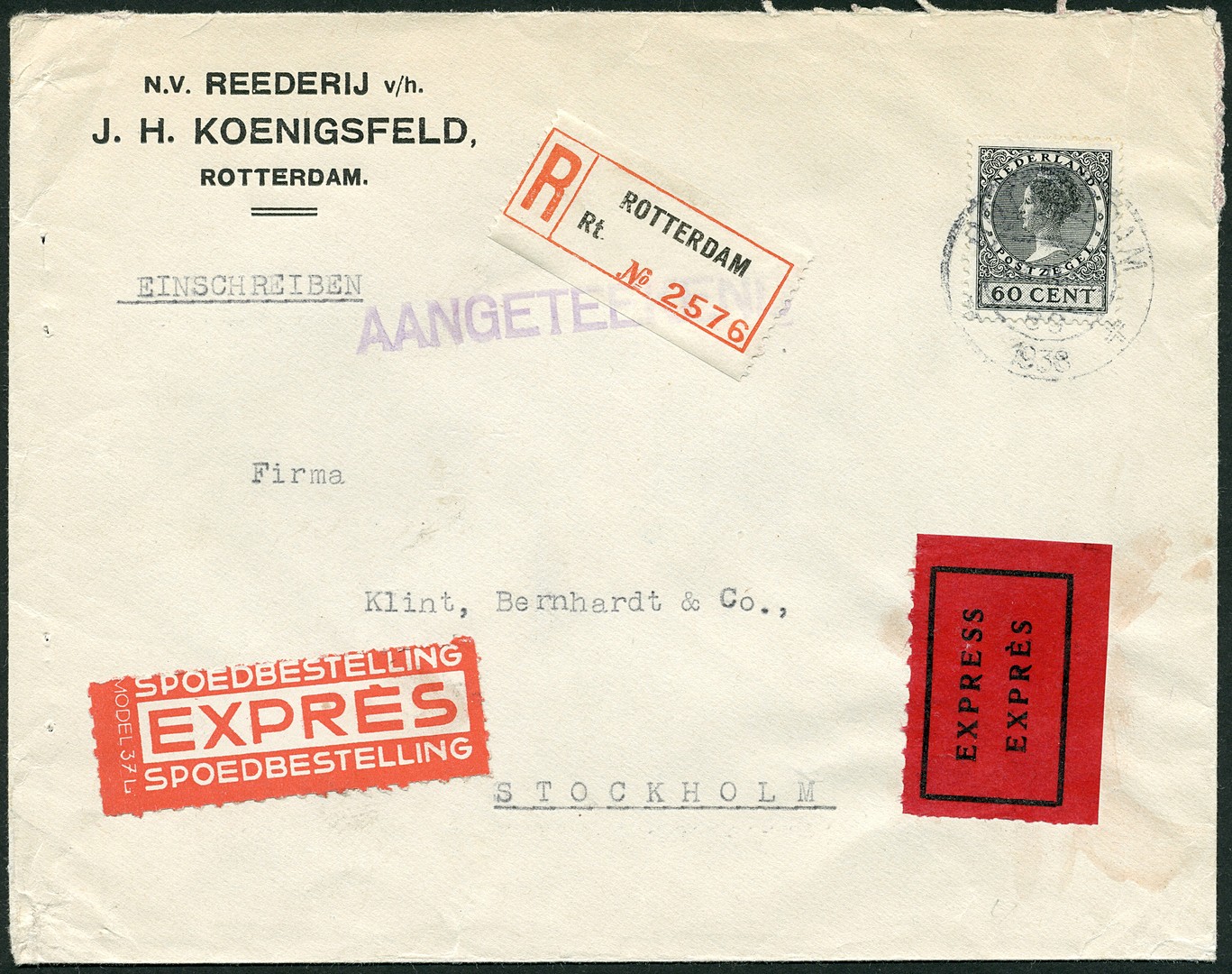 60 Cent zwart type Veth nr. 198 op aangetekende, per Expresse verzonden zakenenvelop van Rotterdam ../2/1938 naar Stockholm 21.2