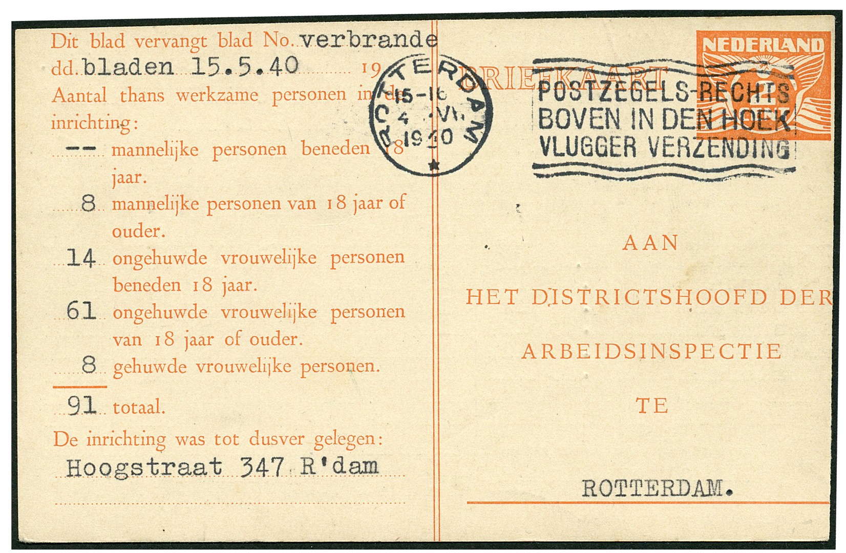 Arbeidslijst G17, ingevuld door het Modemagazijn Gebr. Lampe, met linksboven getypte tekst achter gedrukte 'Dit blad vervangt blad No..../dd....': 'verbrande bladen 15.5.40', verz. binnen Rotterdam 4-7-1940. Op 15 mei 1940, 1 dag na het bombardement, zijn de bladen dus verbrand. Het nieuwe adres is Witte de Withstraat 35a