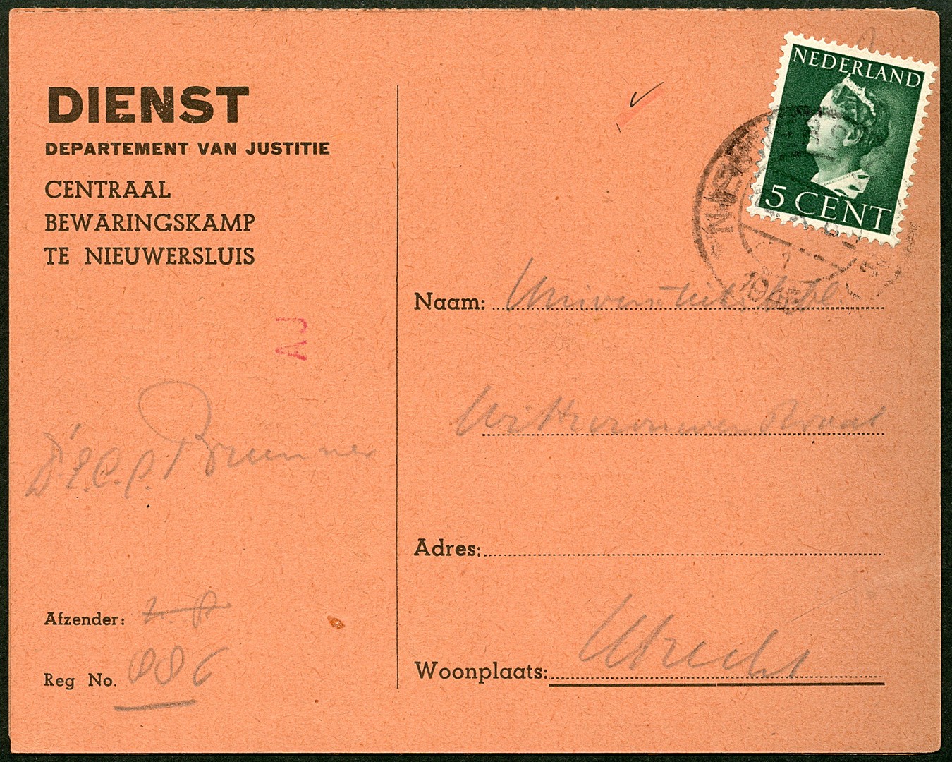 Interneringskampen. Dubbele bk. van het Centraal Bewaringskamp te Nieuwersluis gefr. met 5c op 7-1-1945 door een dr. naar de Universiteit van Utrecht met een verzoek omtrent literatuur. In dit kamp zijn tot 1951 ´foute´ Nederlanders geïnterneerd geweest