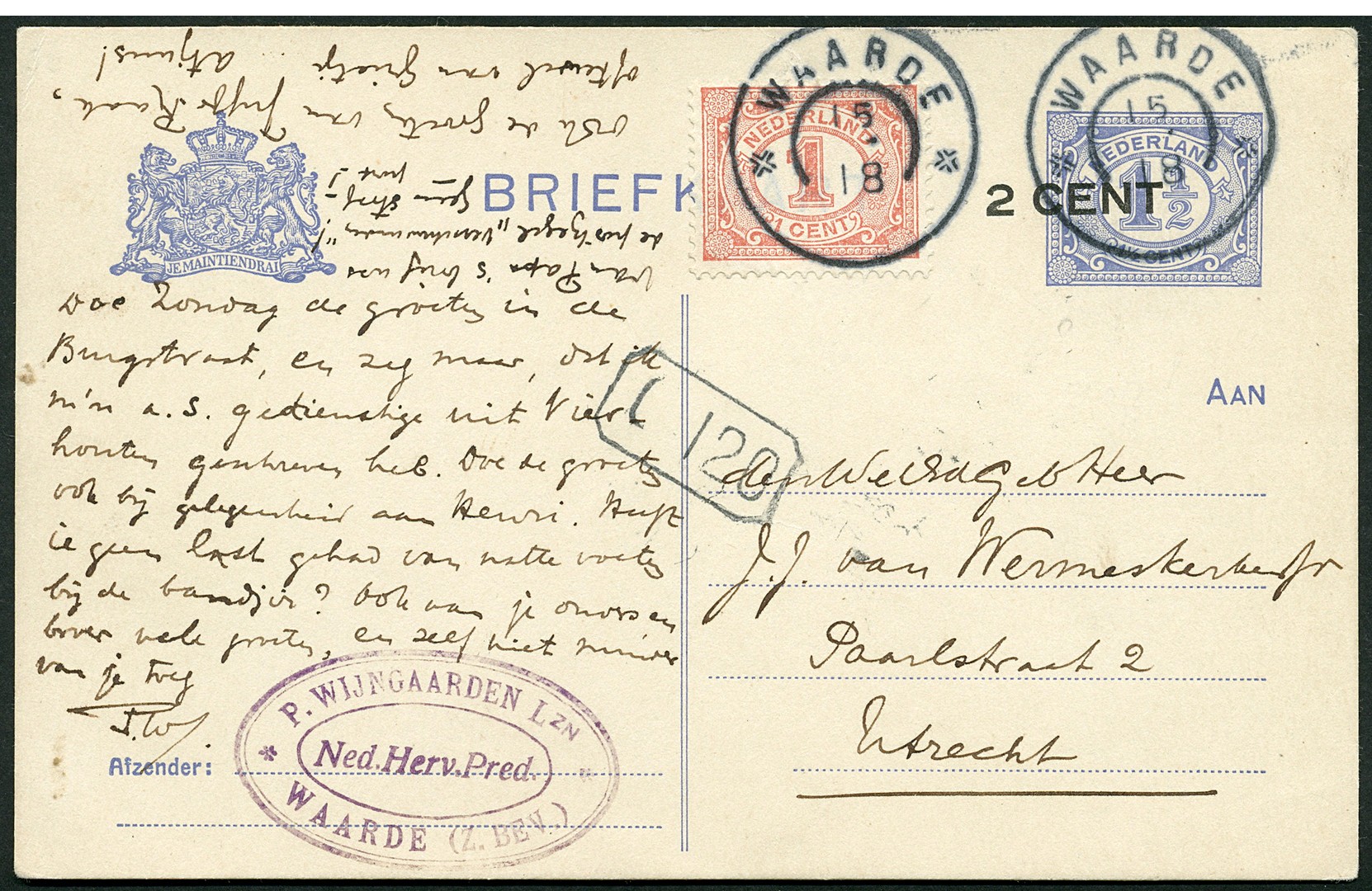 Bk. G92-I met variëteit ´naar links verschoven opdruk 2 CENT´, bijgefr. met 1c en 2x prachtig afgest. met grootrond Waarde waarin maand- en uurkarakters ontbreken, op 15-?-1918 naar Utrecht. De schrijver meldt o.a. ´Trof ´m aan tusschen andere briefkaarten in.´