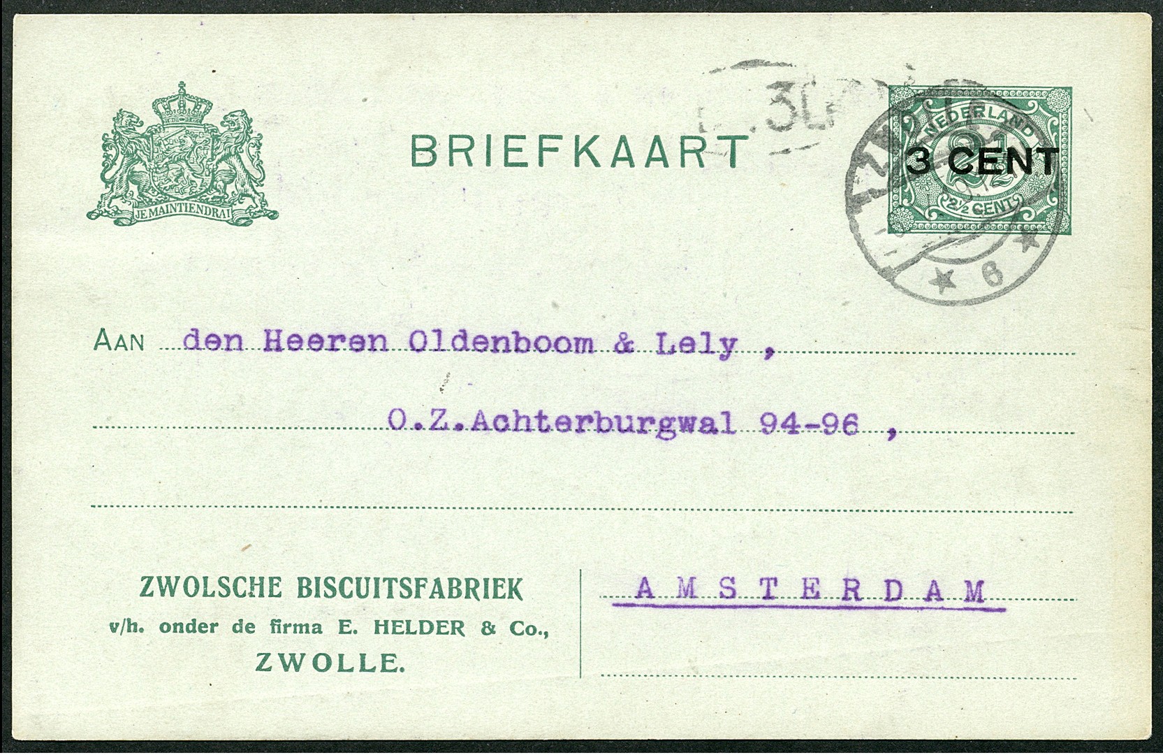 Particulier bedrukte bk. met tekst ´ZWOLSCHE BISCUITSFABRIEK/v/h. onder de firma E. HELDER & Co.,/ZWOLLE´ P96a-IIh. Prachtkaart zakelijk gebruikt van Zwolle 6-5-1919 naar Amsterdam