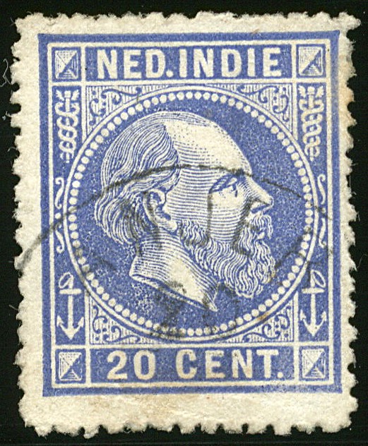 Halfrond-franco ANJER op 20c nr. 12. Vrijwel prachtex. met duidelijke afdruk waarvan volledige naam zichtbaar is, van dit op deze zegel zeer zeldzame stempel (V.1000)