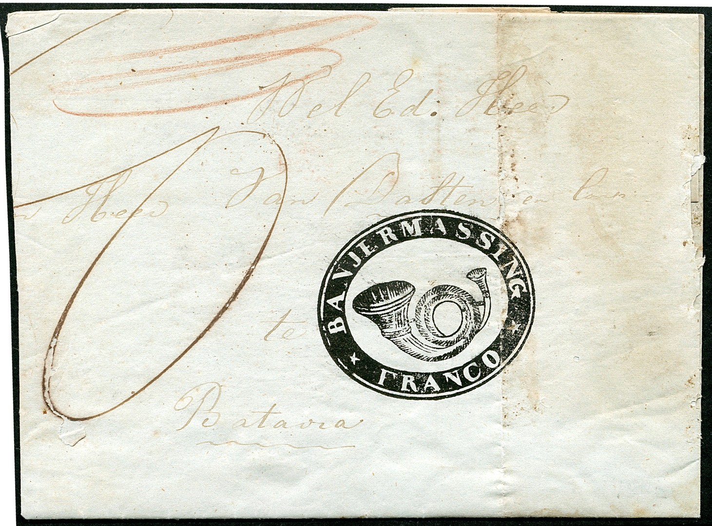 BANJERMASSING. Negatief ovaalstempel met posthoorn 'Banjermassing/Franco' in zwart (WdB.100a) op enigszins gehavende complete brief geschreven te Marabahan (eiland Borneo) 8-9-1842 over Bandjermasin naar Batavia, met geschreven ontvangstdatum 27-9. Superbe afdruk, bovendien zeer vroeg gebruik (WdB. bekend in 1856 en 1861)