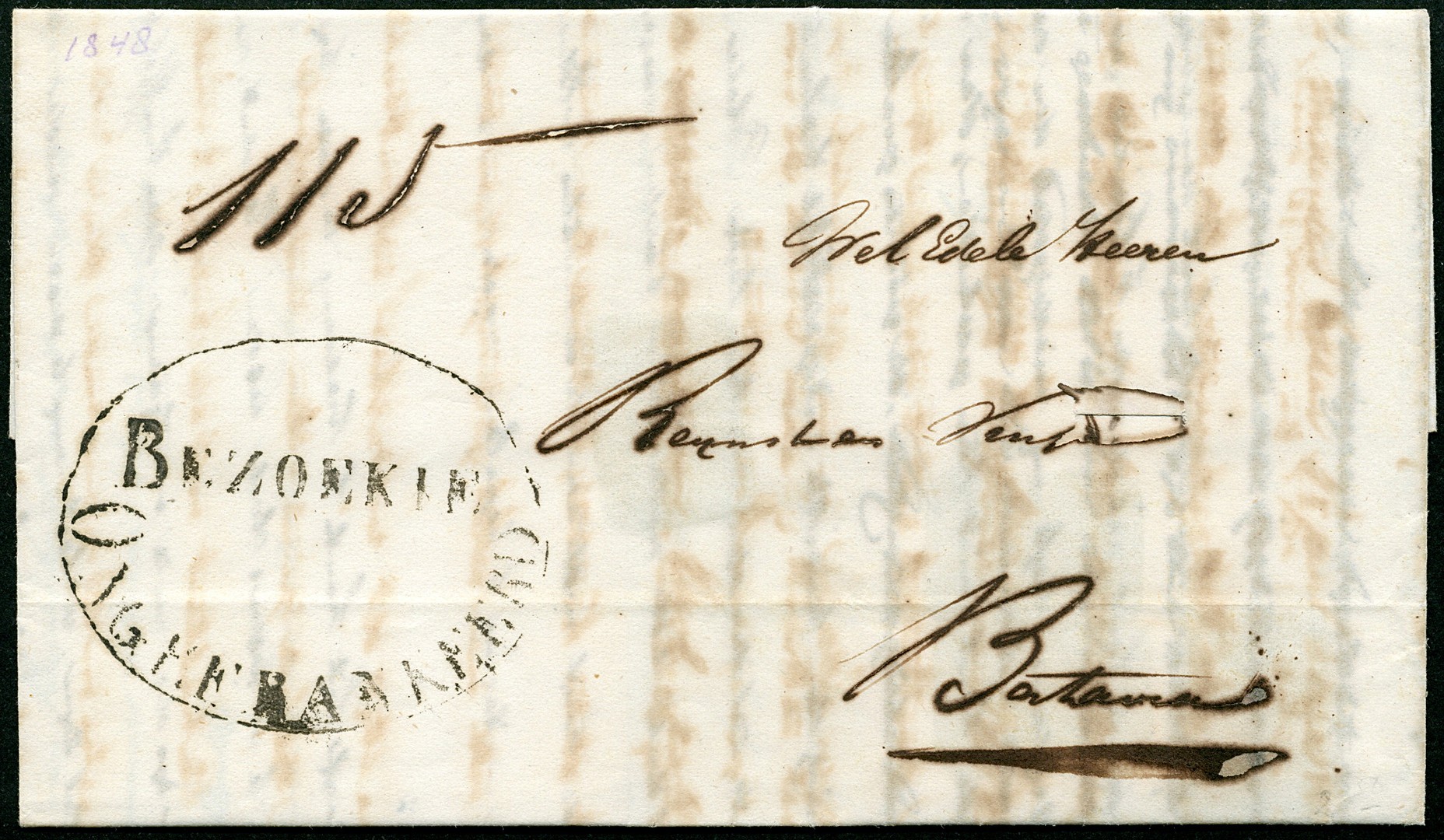 BEZOEKIE. Ovaalstempel 'Bezoekie/Ongefrankeerd' in zwart (WdB.126a) op complete vouwbrief van 8-8-1848 naar Batavia, met geschreven port '115' duiten. Mooie afst.