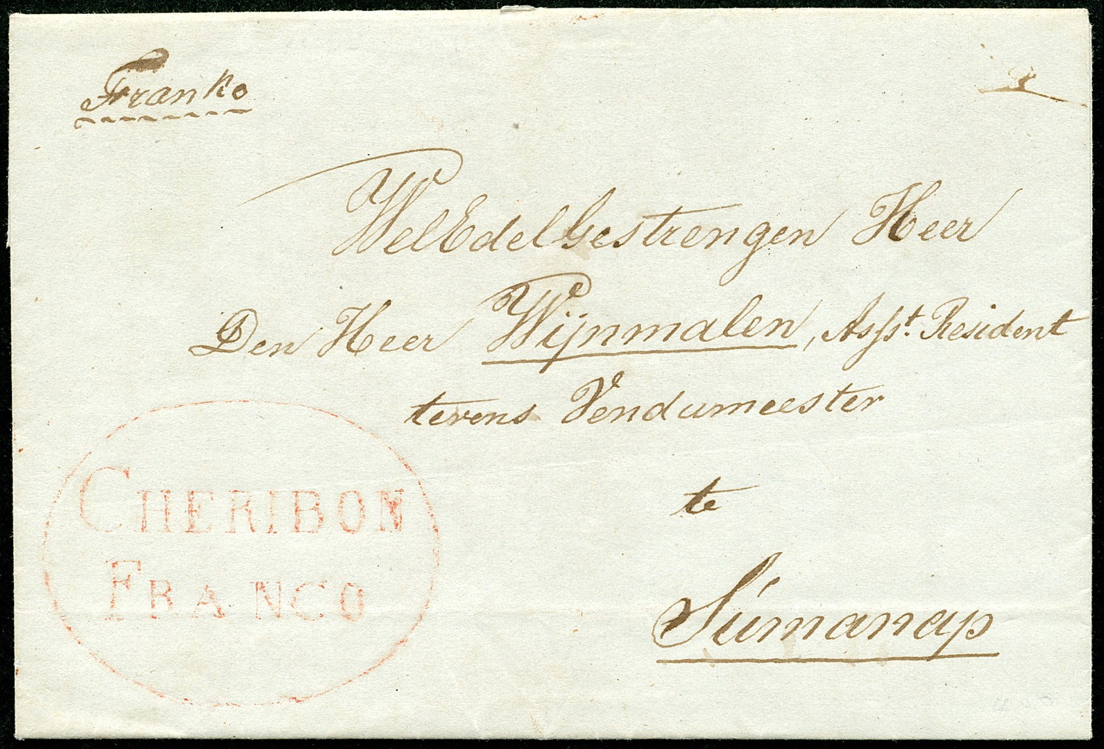 CHERIBON. Ovaalstempel 'Cheribon/Franco' in rood (WdB.141c) op luxe brief van 12-10-1848 naar Sumanap op Madoera, waar de echtgenoot van de briefschrijfster is overleden, met op az. geschreven betaalde port van '85' duiten. Prachtstuk in alle opzichten!