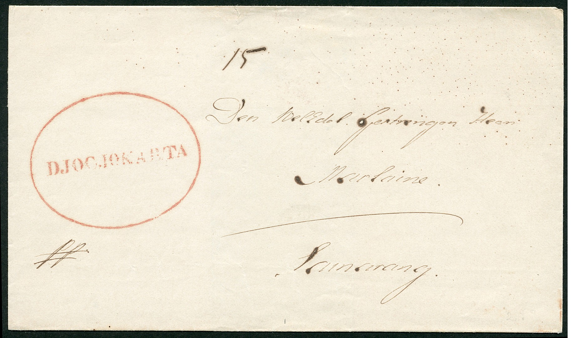DJOCJOKARTA. Ovaalstempel 'Djocjokarta' in rood (WdB.148c) op frisse briefomslag met potloodnotitie 29-7-1852 naar Samarang, met geschreven port '15' duiten. Prachtafdruk!