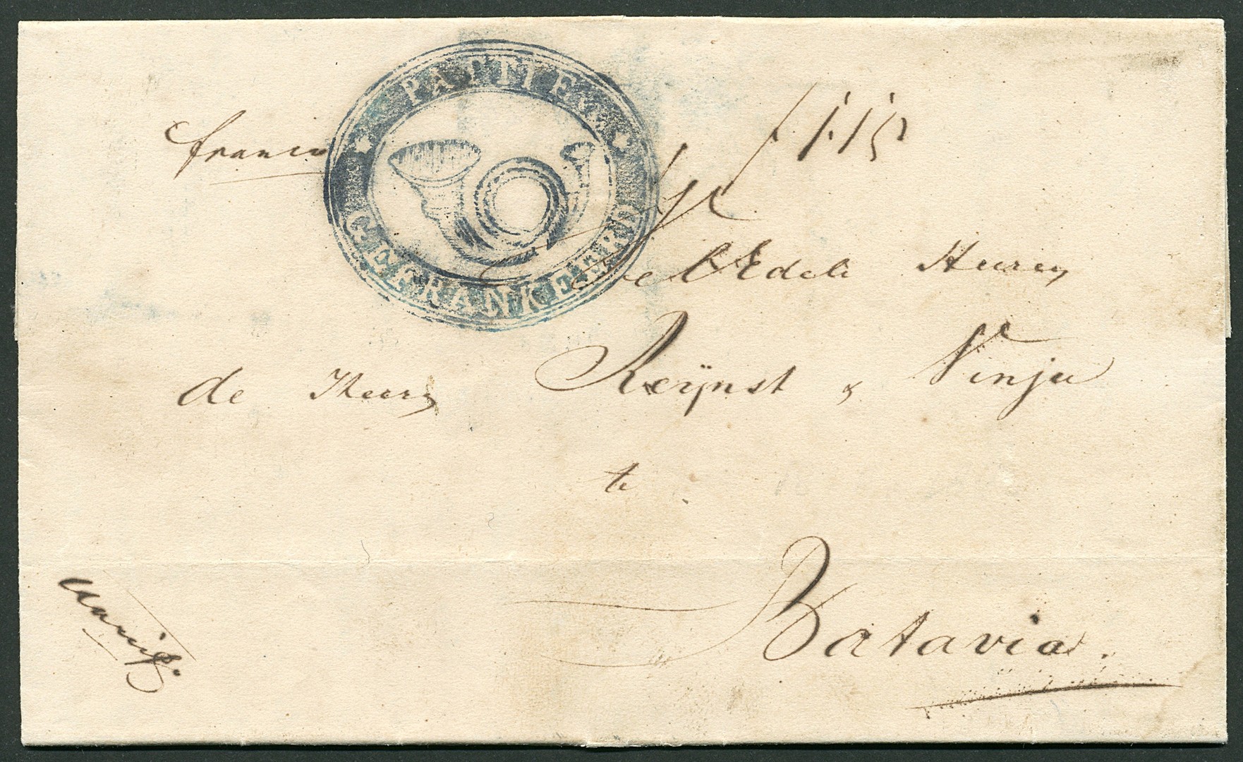 PATTIE. Negatief ovaalstempel 'Pattie/Gefrankeerd' met posthoorn in blauw (WdB.226b) op mooie complete brief van Pakis 18-8-1842 over Pattie naar Batavia, met geschreven betaald port van '115' centen koper. Prachtafdruk!