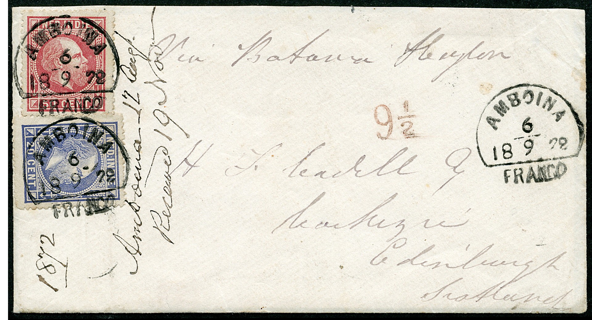 AMBOINA. 20 Cent nr. 12A en 50c nr. 15A op zeer fris couvert van Amboina 6-9-1872 via Batavia en Southampton over Prestonpans 19-10 naar Edinburgh, met op vz. Brits portstempel 9½ in rood. Drie schitterende afdrukken van het halfrond-francostempel. Ons maar een paar brieven bekend. Prachtstuk voor de verwende collectioneur! Ex Voerman