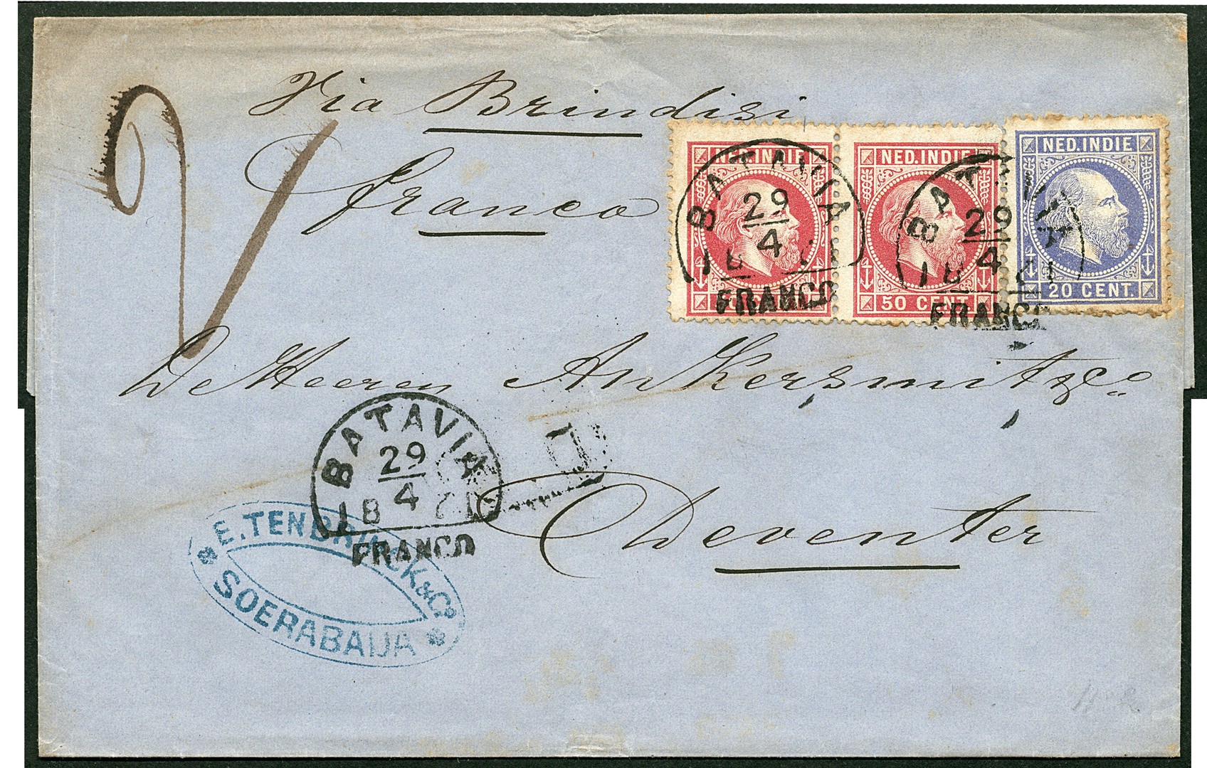 BATAVIA. 20 Cent nr. 12A en 50c nr. 15A in prachtpaar op briefomslag van de tweede gew. klasse (geschreven ´2´ dus dubbel port), afz. te Soerabaija, afgest. Batavia 29-4-1871 via Brindisi naar Deventer 9-6