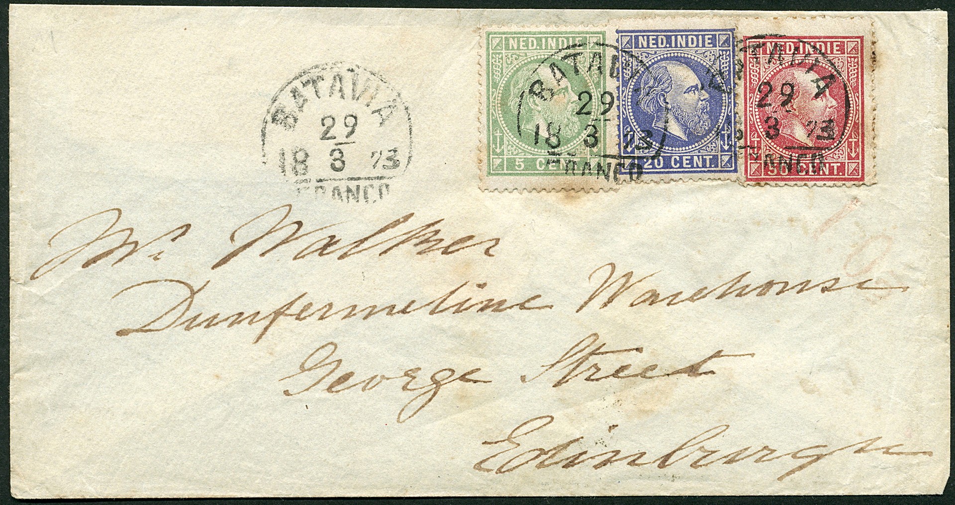 BATAVIA. 5 Cent nr. 8A, 20c nr. 12A en 50c nr. 15A op envelop van Batavia 29-3-1873 naar Edinburgh 5-5, met op vz. tevens Brits portstempel ´1.0½´. Mooie driekleurenfrankering volgens briefport van 75 cent