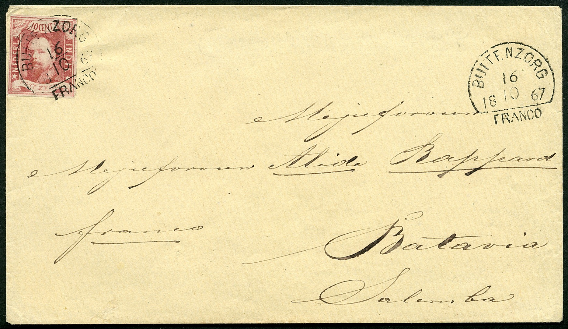 BUITENZORG. 10 Cent nr. 1 op zeer frisse, gele envelop van Buitenzorg 16-10-1867 naar een mejuffrouw in Salemba, een wijk van Batavia 16-10
