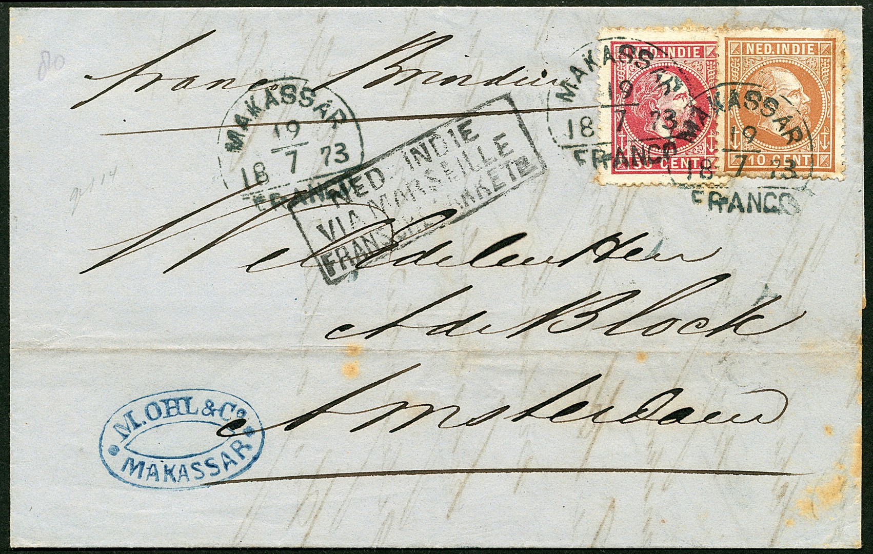 MAKASSAR. 10 Cent nr. 9A en 50c nr. 15A op vouwbrief van Makassar 19-7-1873 via Marseille (door afz. geschreven ´franco Brindisi´) naar Amsterdam 8-9. Drie prachtige afdrukken van het halfrond-francostempel