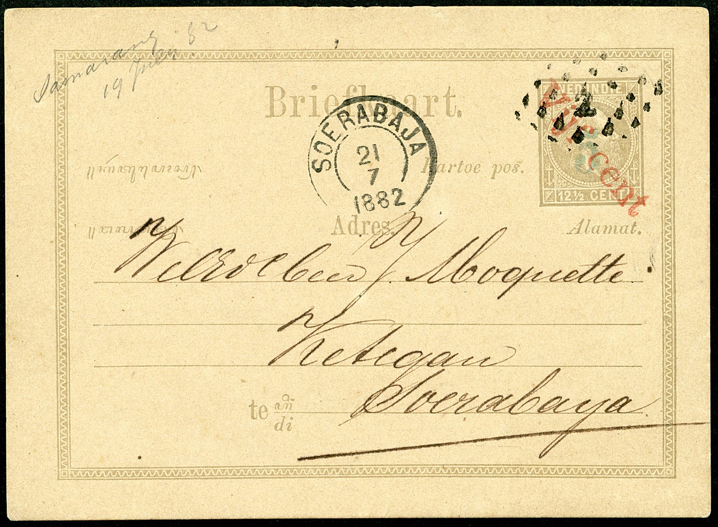 Moquette. Bk. G3 met tweeregelige fantasie-opdruk ´5 cent´ in blauw van Samarang 11-9-1879 naar Soerabaja 12-9, alsmede bk. G4 met diagonale fantasie-opdruk ´Vijf cent´ in rood geschreven te Semarang 19-7-1882, afgest. Soerabaja 21-7