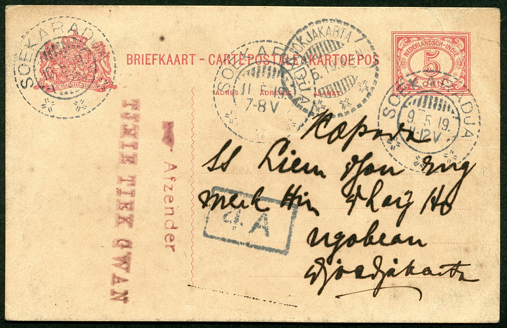 Kortebalk met uur-stempels van Pengalengan (1919, SvL 75, env. G39 op az. bedrukt ´R.A. Kerkhoven´), Soekaradja (3 verschillende data in 1919 op bk. SvL 225) en Soreang (1922, SvL 150)