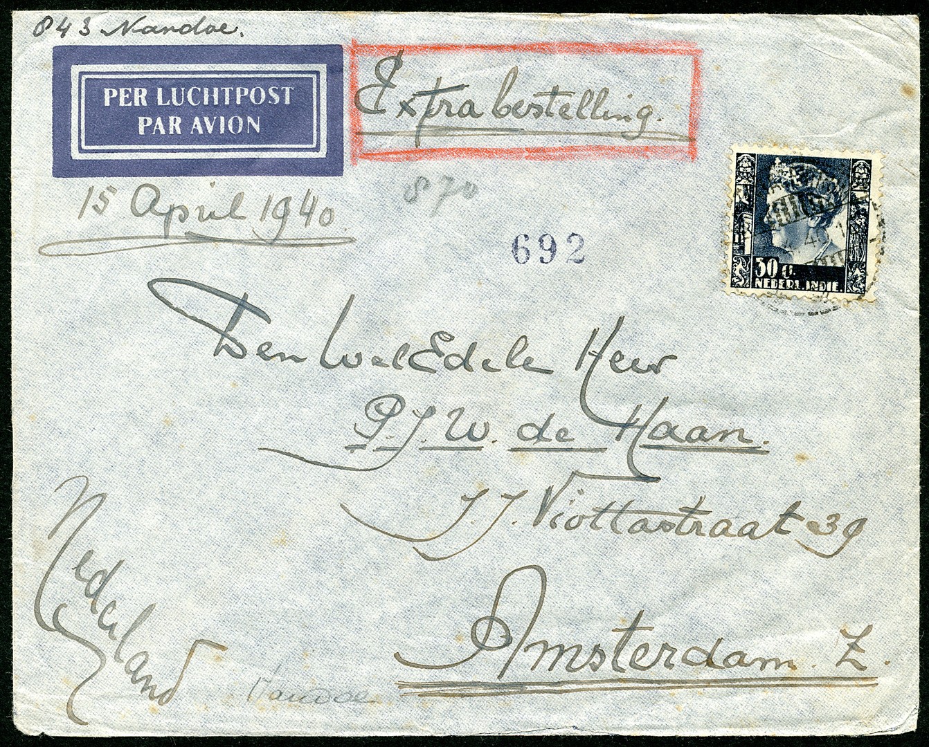 Luchtpostenvelop van Bataviacentrum 14-4-1940 naar Amsterdam 26-4 met 30c Kreisler als correcte frankering voor het port (20 cent) + extra bestelling (10 cent). Als zodanig een zeldzame enkelfrankering!