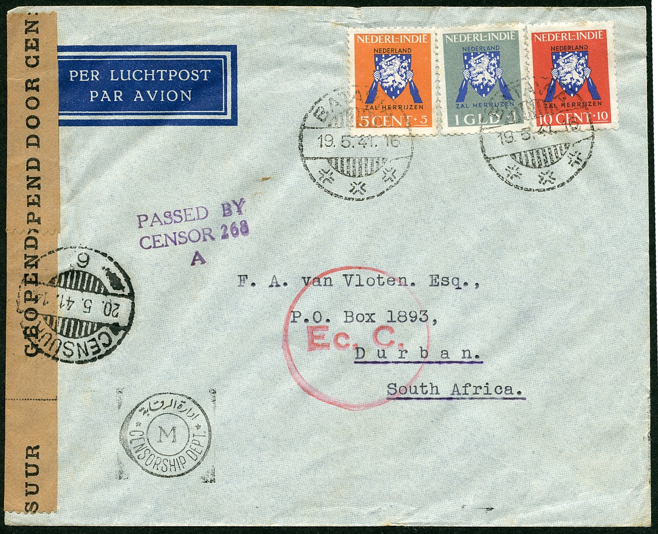 Twee met Vrij Nederland-zegels gefr. en gecensureerde luchtpostenv. van Batavia 19-5-1941 naar Durban, Zuid-Afrika, resp. van Pematang-/Siantar aangetekend op 14-5-1941 naar Horn, Zwitserland, 9-6