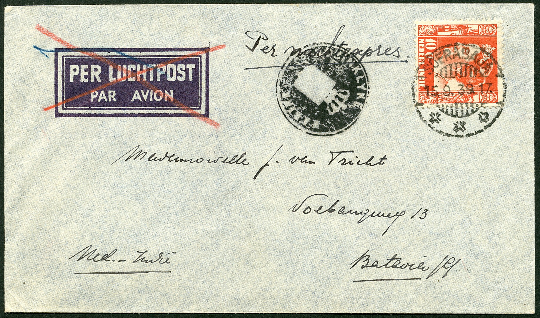 Zwarte afdruk van een negatief rondstempel KONINKLYKE MARINE i.p.v. het gebruikelijke rondstempel van het Marine postkantoor, op env. van Soerabaja 15-9-1939 ´Per nachtexpres´ naar Batavia-C. Door ons nog niet eerder gezien