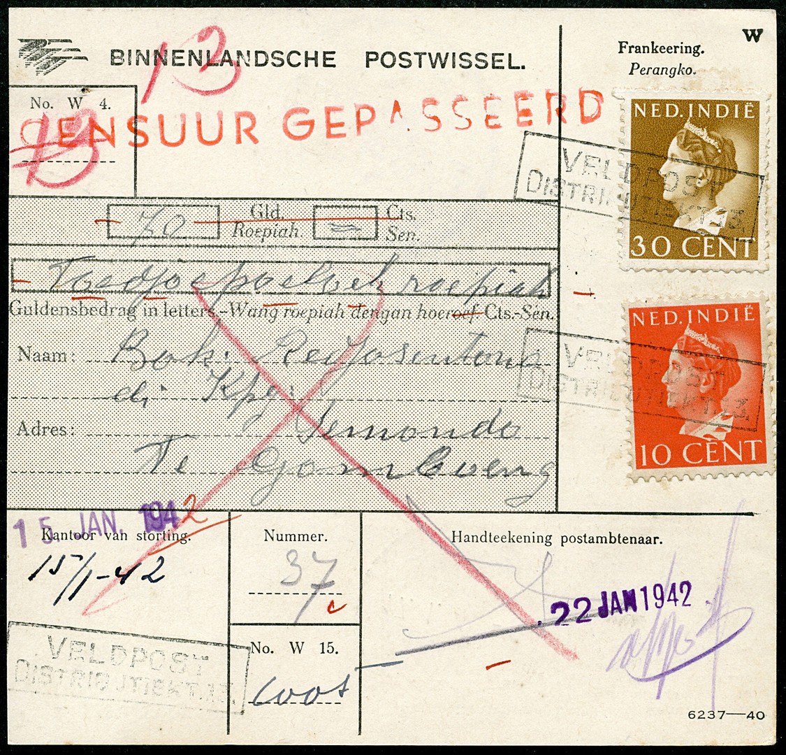 Vier postwissels 1941-42 waarop Van Konijnenburgzegels van 80c (2x enkel), 10c+30c en 40c (enkel), afgest. met type ´Veldpost/Distributiekt.+nummer´ in kader, gecensureerd en met de veldpost verzonden