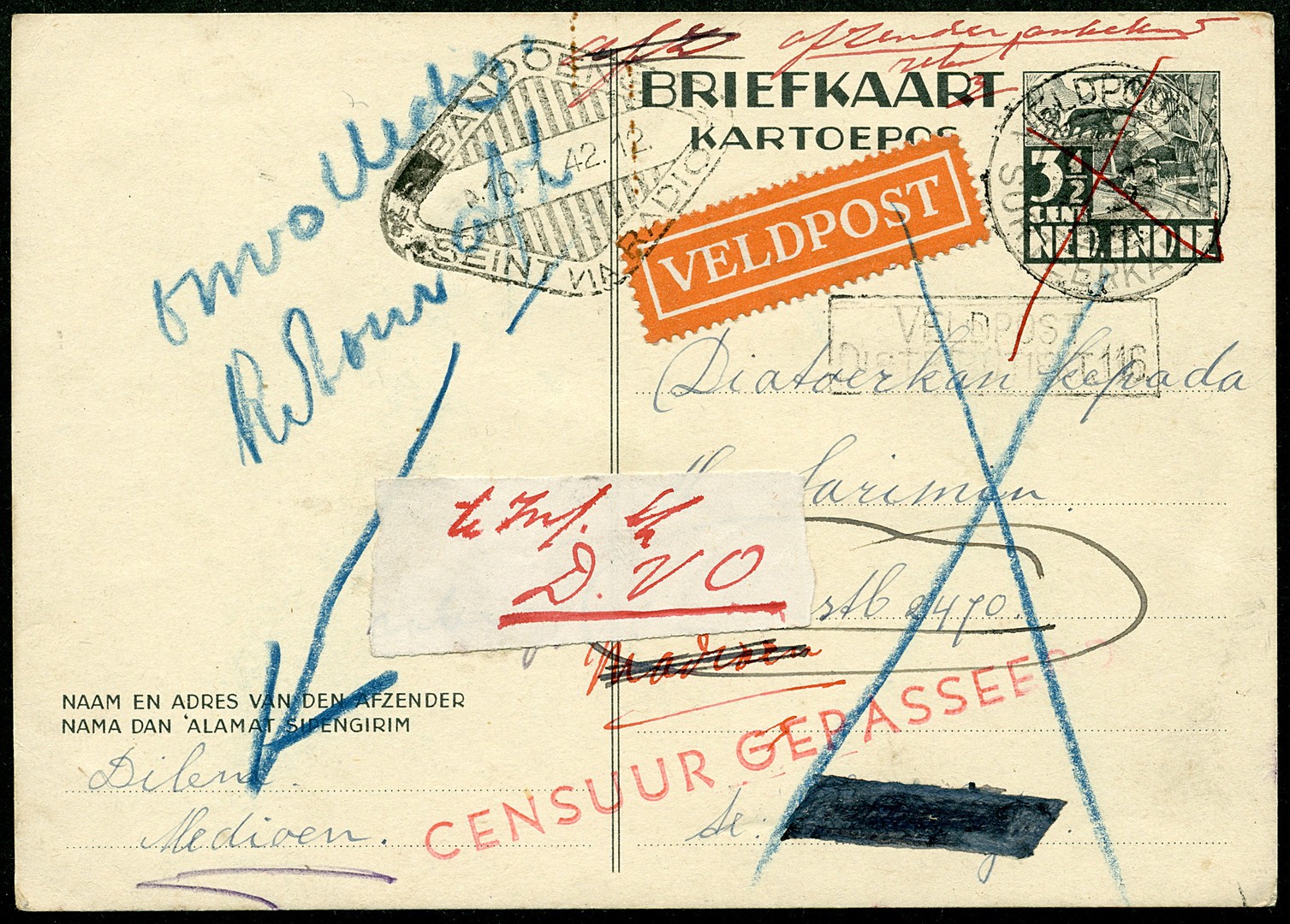 Bk. G68 als veldpostbriefkaart geschreven te Madioen op 5/1-42, afgest. Veldpost/Sorteerkantoor D (Soerabaja) naar een militair, plaatsnaam onleesbaar gemaakt, in blauw ´onvolledig/Retour afz´, retour via Bandoeng 10-1 maar adres afzender in Madioen onbekend, met rode pen ´afzender onbekend´, kruis door veldpoststempel, inf. bij het D.v.O. etc.
