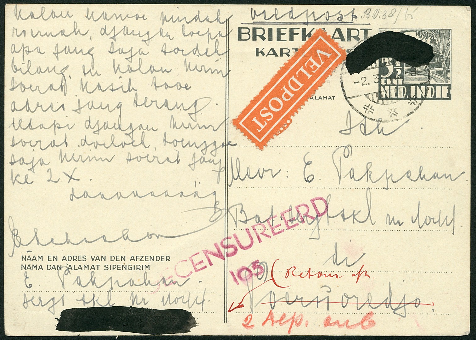 Bk. G68 als veldpostbriefkaart geschreven op 1/3-´42, plaatsnaam in afzendadres en poststempel met oostindische inkt goed onleesbaar gemaakt, naar een mevrouw in Poerworedjo, doch retour