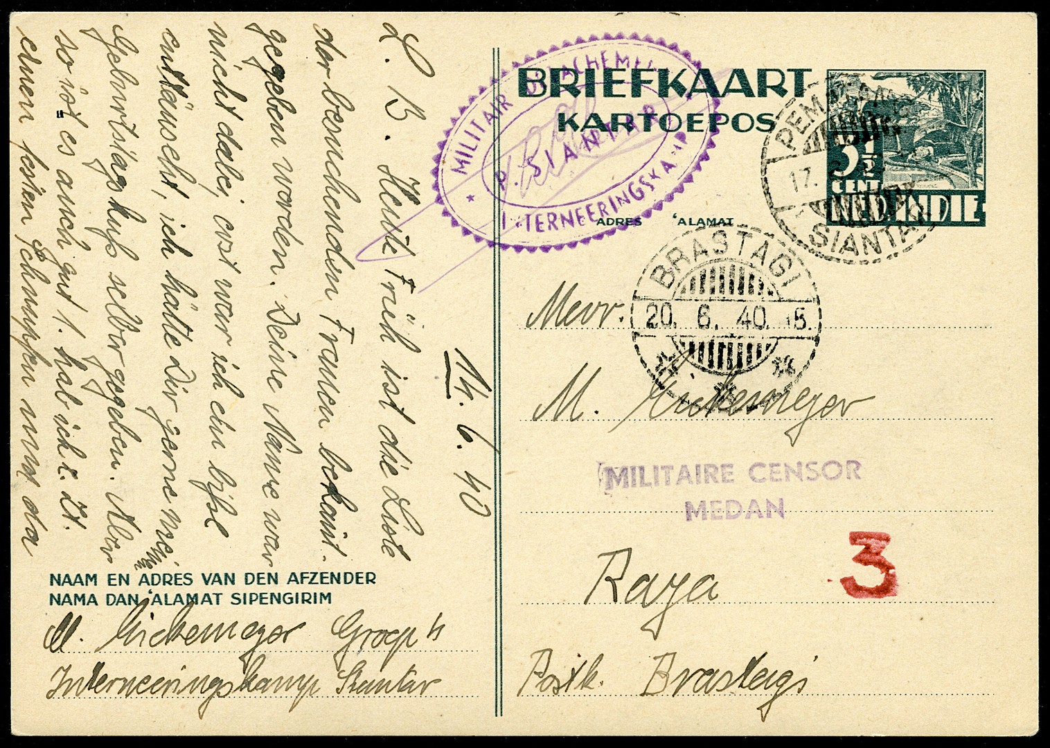 Interneringskampen. Pematang Siantar. Luxe afdruk ovaalstempel ´MILITAIR DETACHEMENT/INTERNEERINGSKAMP/P. SIANTAR´ met handtekening op bk. via Pematang-/Siantar 17-6-1940 over Brastagi 20-6 naar een geïnterneerde in het kamp Raja, te Medan gecensureerd en tevens met rode ´3´