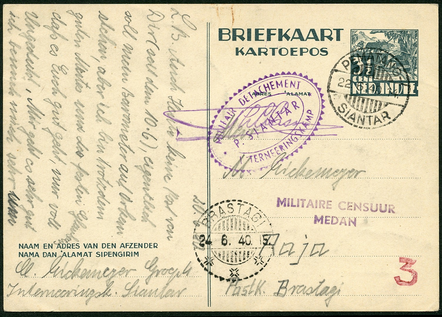 Interneringskampen. Pematang Siantar. Luxe afdruk ovaalstempel ´MILITAIR DETACHEMENT/INTERNEERINGSKAMP/P. SIANTAR´ met handtekening op bk. via Pematang-/Siantar 22-6-1940 over Brastagi 24-6 naar een geïnterneerde in het kamp Raja, te Medan gecensureerd en tevens met rode ´3´