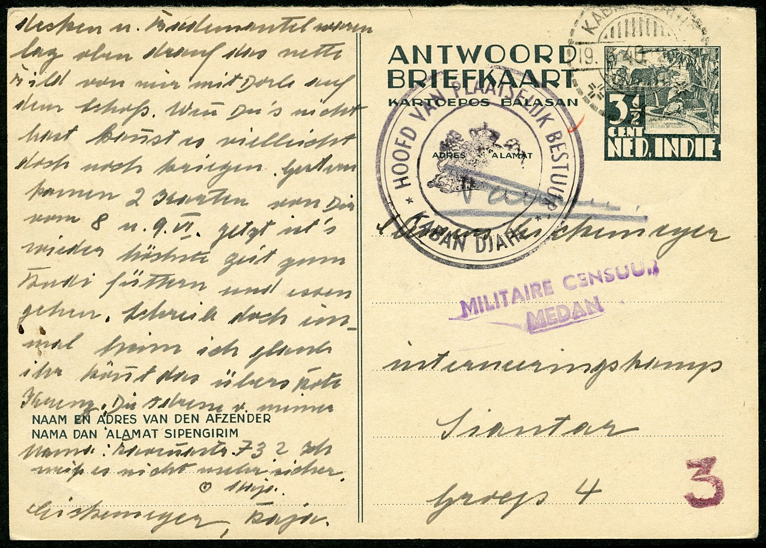 Interneringskampen. Alasvallei. Luxe afdruk rondstempel ´HOOFD VAN PLAATSELIJK BESTUUR/KABANDJAHE´ met handtekening op A-kaart van een geïnterneerde Duitser via Kabandjahé 19-5-1940 naar zijn familielid in het kamp te Pematang Siantar, met rode ´3´ en ´MILITAIRE CENSUUR/MEDAN´
