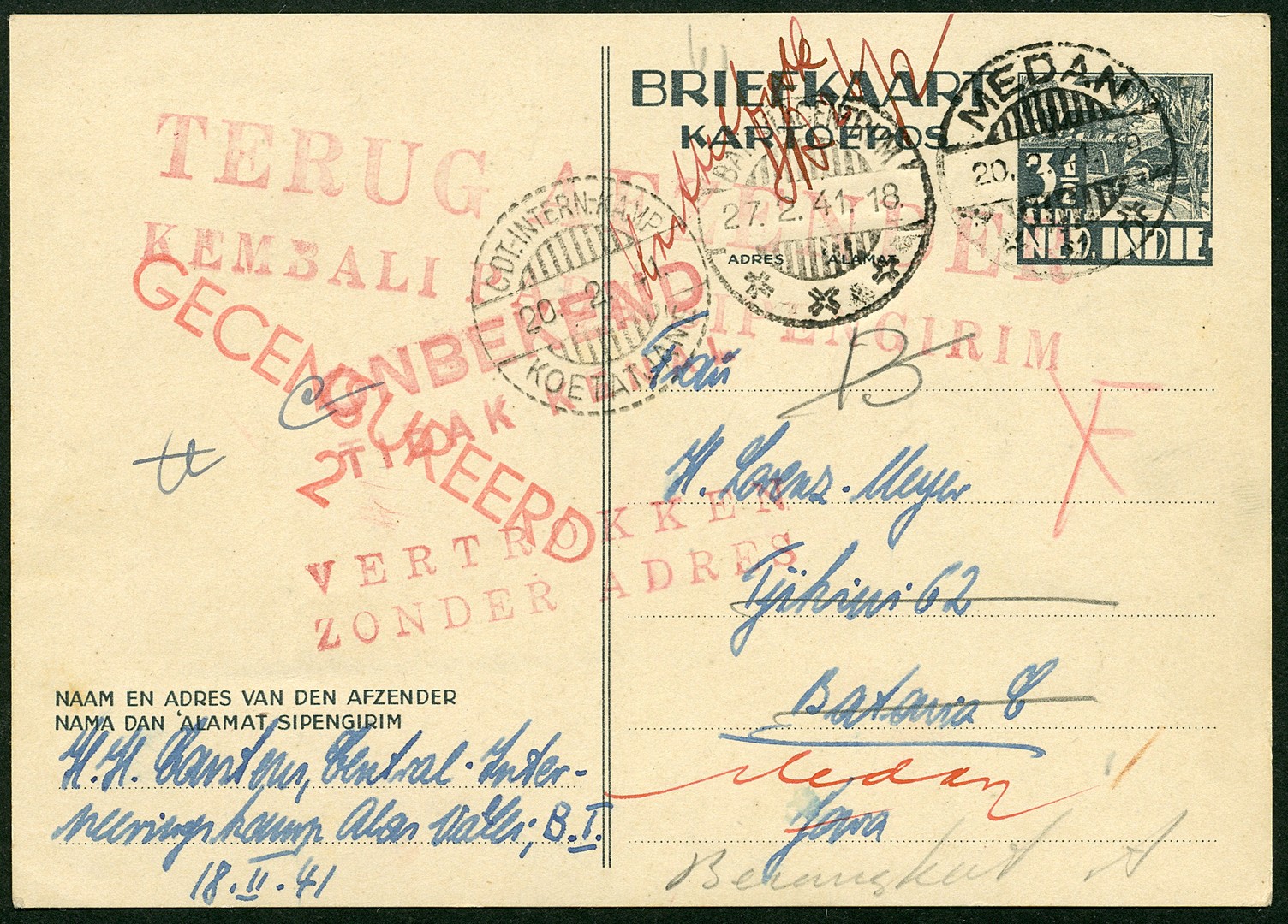 Interneringskampen. Alasvallei. Gecensureerde bk. van Duitse geïnterneerde op 20-2-1941 afgest. ´CDT.-INTERN.-KAMP/KOETATJANÉ´ via Medan naar een Duitse dame te Batavia-C. maar op 27-2 retour omdat zij is ´VERTROKKEN/ZONDER ADRES´, met tevens stempelafdrukken ´TERUG AFZENDER/KEMBALI PADA SIPENGIRIM´ en ´ONBEKEND/TIDAK KENAL´