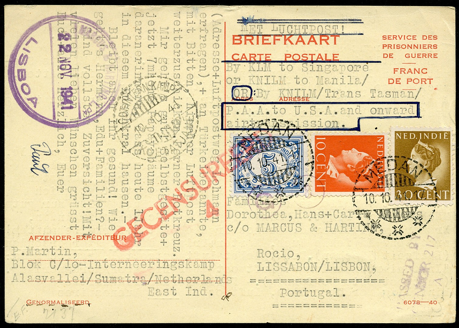 Interneringskampen. Alasvallei. Bk. van een Duitse geïnterneerde op 10-10-1941 afgest. ´CDT.-INTERN.-KAMP/KOETATJANÉ´ gefr. met 45 cent voor luchtpostverzending van Medan 10-10-1941 naar Lissabon met het verzoek aan de firma Marcus & Harting om de kaart door te sturen naar familie in Bremen. In Indië en Singapore gecensureerd, geen Duitse censuurstempel, linksboven violet stempel van de firma in Lissabon met datum 22-11-1941. Bijzondere kaart!