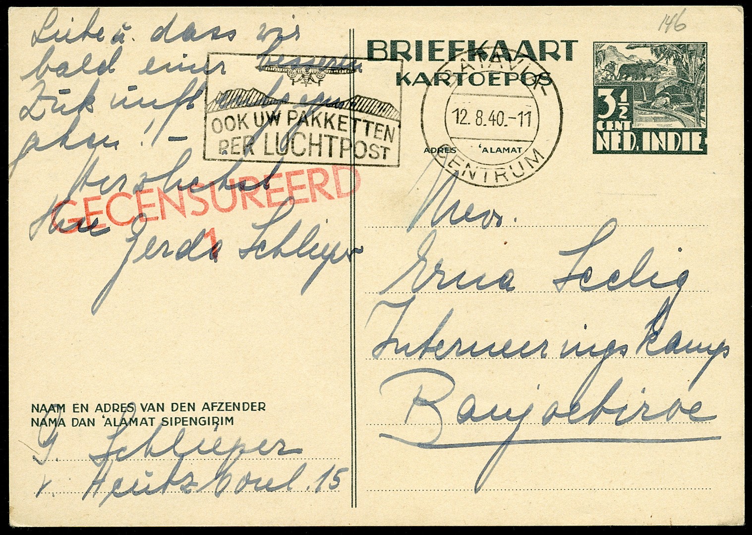 Interneringskampen. Banjoebiroe. Bk. van Duitse vrouw in de Van Heutszboulevard 15 te Batavia-C. op 12-8-1940 naar geïnterneerde Duitse vrouw in het interneringskamp Banjoebiroe
