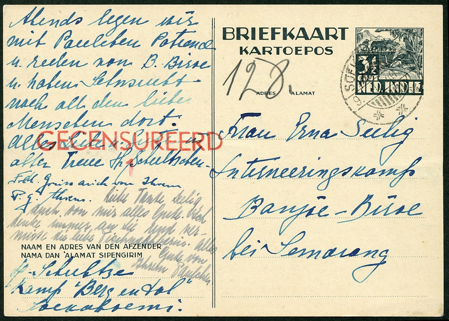 Interneringskampen. Berg en Dal. Gecensureerde bk. (az. zin zwart gemaakt) geschreven door geïnterneerde vrouw in het kamp Berg en Dal te Soekaboemi op 9-9-1940 naar een geïnterneerde vrouw in het kamp Banjoebiroe. Berg en Dal gebruikte nog geen kampstempel